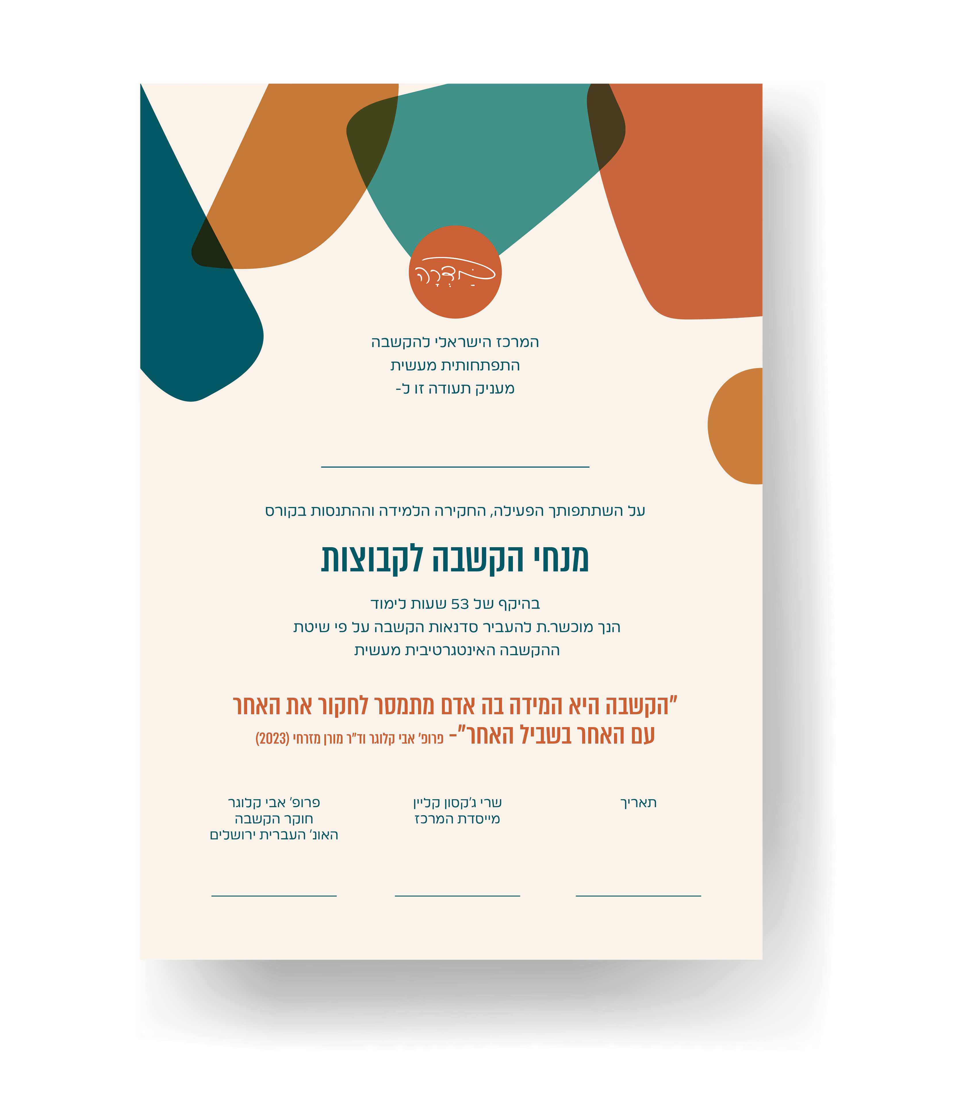 הקורס, אשר מועבר בניהולה של שרי ג׳קסון קליין ובליוויו המקצועי של פרופסור אבי קלוגר מהאוניברסיטה העברית, יעניק לבוגריו תעודת מנחה הקשבה, המאושרת על ידי המרכז.